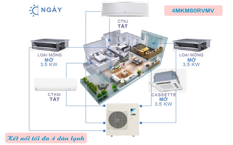 Điều hòa Multi 1 nóng 4 lạnh phù hợp lắp đặt cho những căn nhà có 1 phòng khách và 2 - 3 phòng ngủ